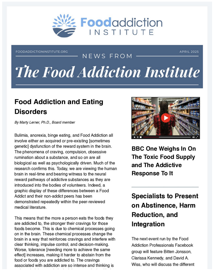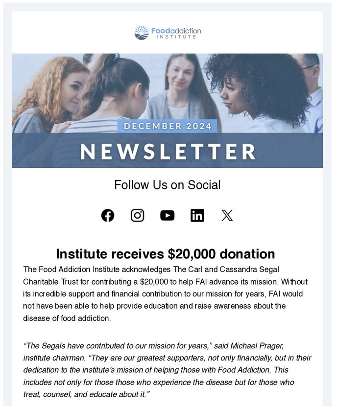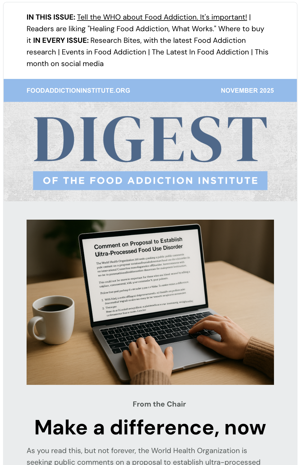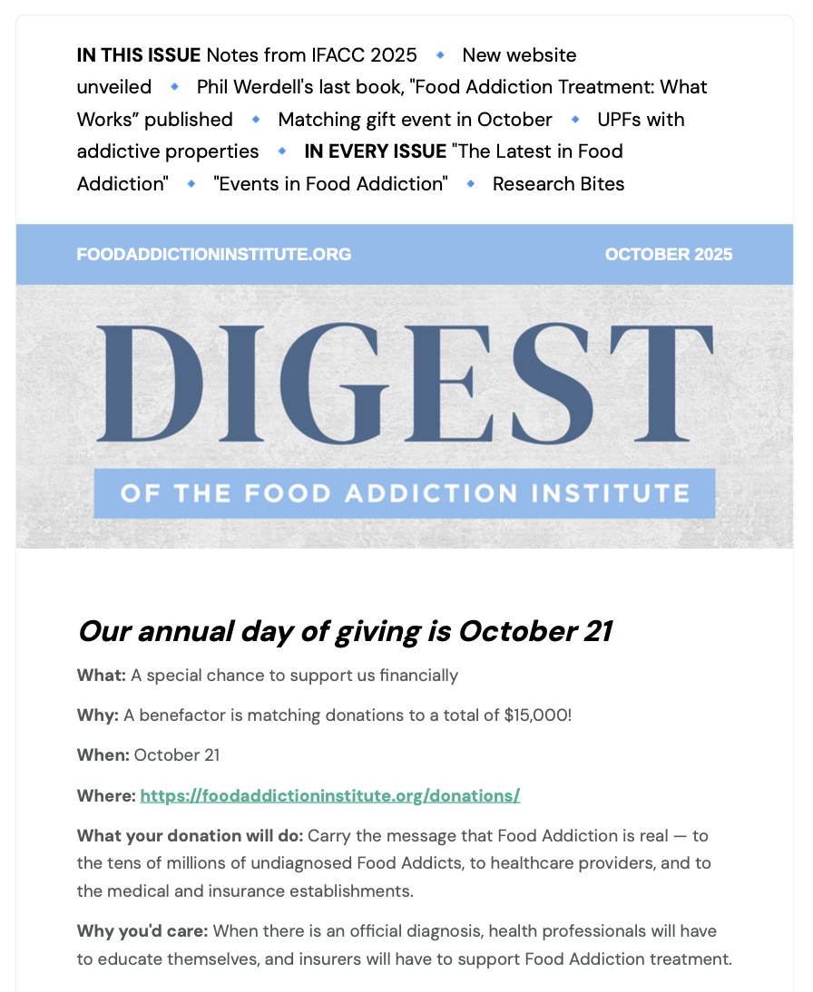 How to “whitelist” The Digest: Please ensure The Digest reaches you by adding community@foodaddictioninstitute.org to your email contacts list. If you need specific instructions for your email client, this link can help.