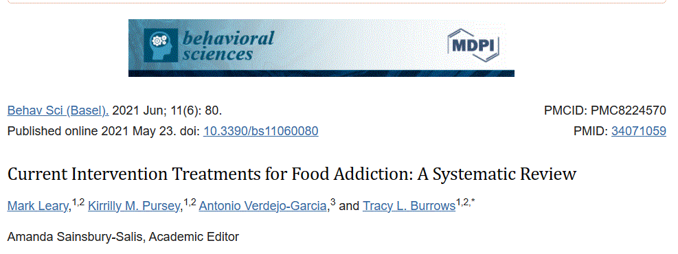 Leary, M.; Pursey, K.M.; Verdejo-Garcia, A.; Burrows, T.L. Current Intervention Treatments for Food Addiction: A Systematic Review. Behav. Sci. 2021, 11, 80. https://doi.org/10.3390/bs11060080