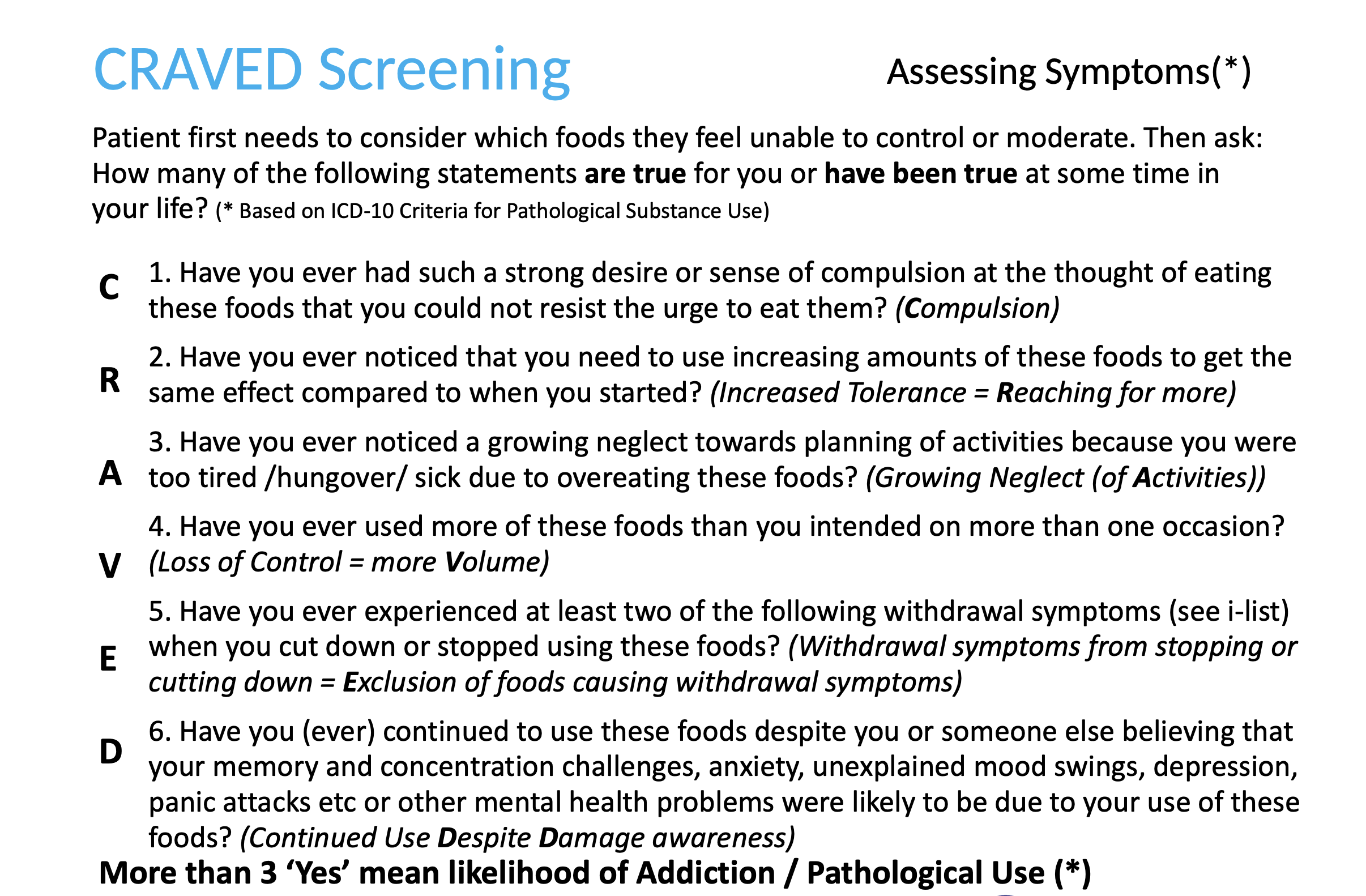 CRAVED is a six-question, yes-or-no screening tool that accounts for behavioral indicators of Food Addiction.