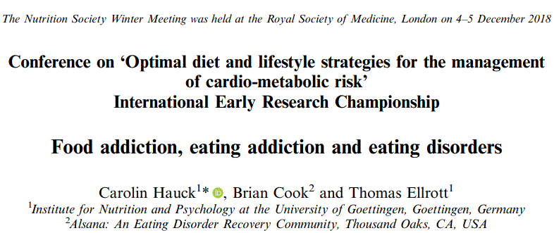Hauck, C., Cook, B., & Ellrott, T. (2020). Food addiction, eating addiction and eating disorders. Proceedings of the Nutrition Society, 79(1), 103–112. doi:10.1017/S0029665119001162